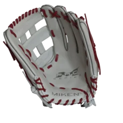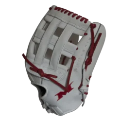 Let us help you gear up for the 2019 year with this 13.5″ White and Scarlet Slowpitch Softball Fielding Glove, featuring Mikens Pro H-Web Pattern designed for adult softball. Order today with our fast free shipping here at headbangersports.com!Â